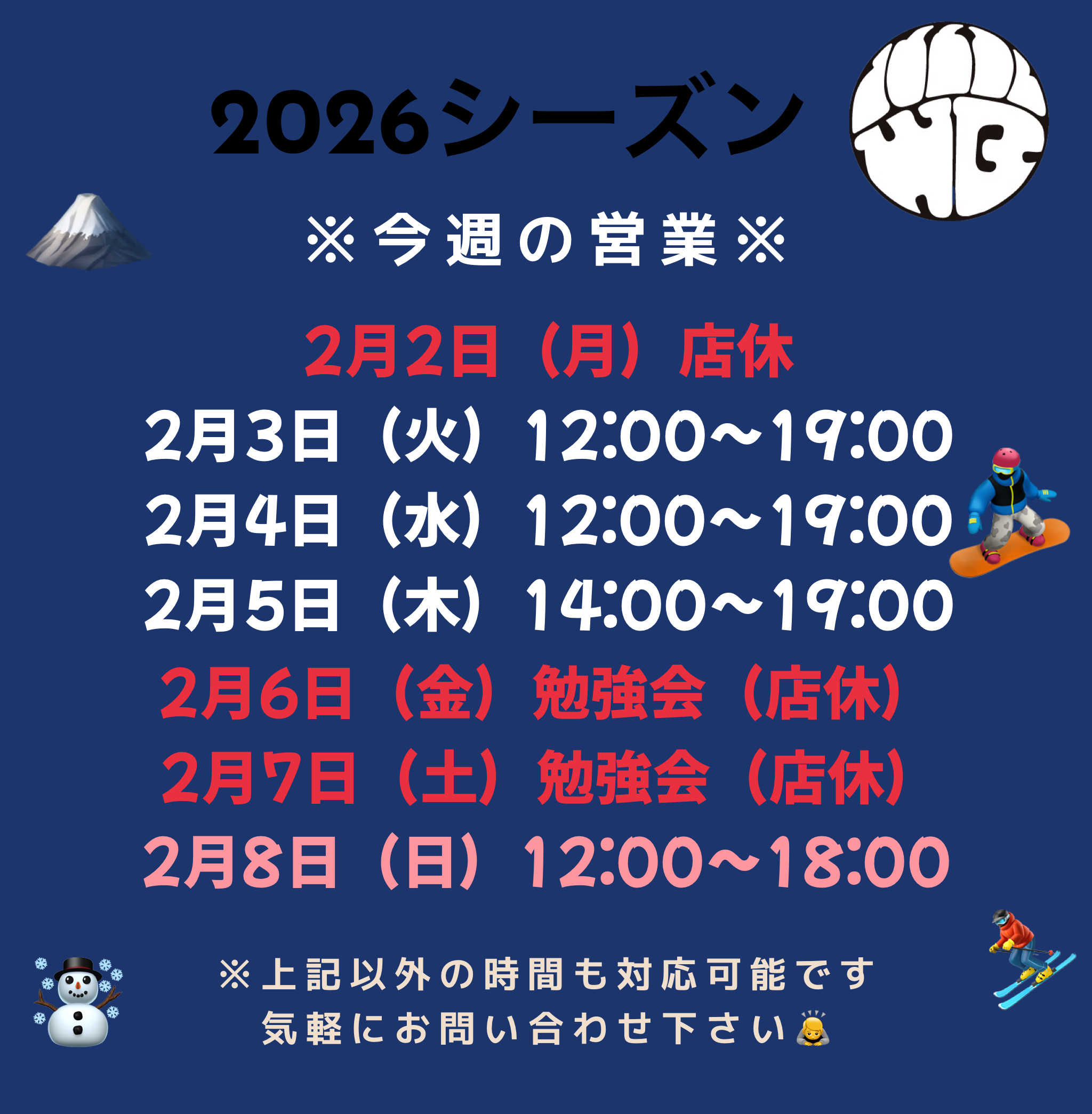 店休日 2022/2023シーズンは不定休、年末年始、スクール開催日、ツアー、雪山に上がる日等…